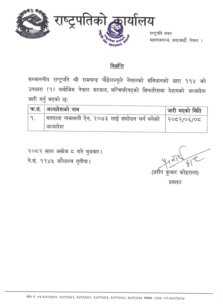 मतदाता नामावली ऐन, २०७३ लाई संशोधन गर्न अध्यादेश जारी भएको छ। राष्ट्रपति रामचन्द्र पौडेलले बुधबार मतदाता नामावली संशोधनसम्बन्धी अध्यादेश जारी गरेका हुन्।