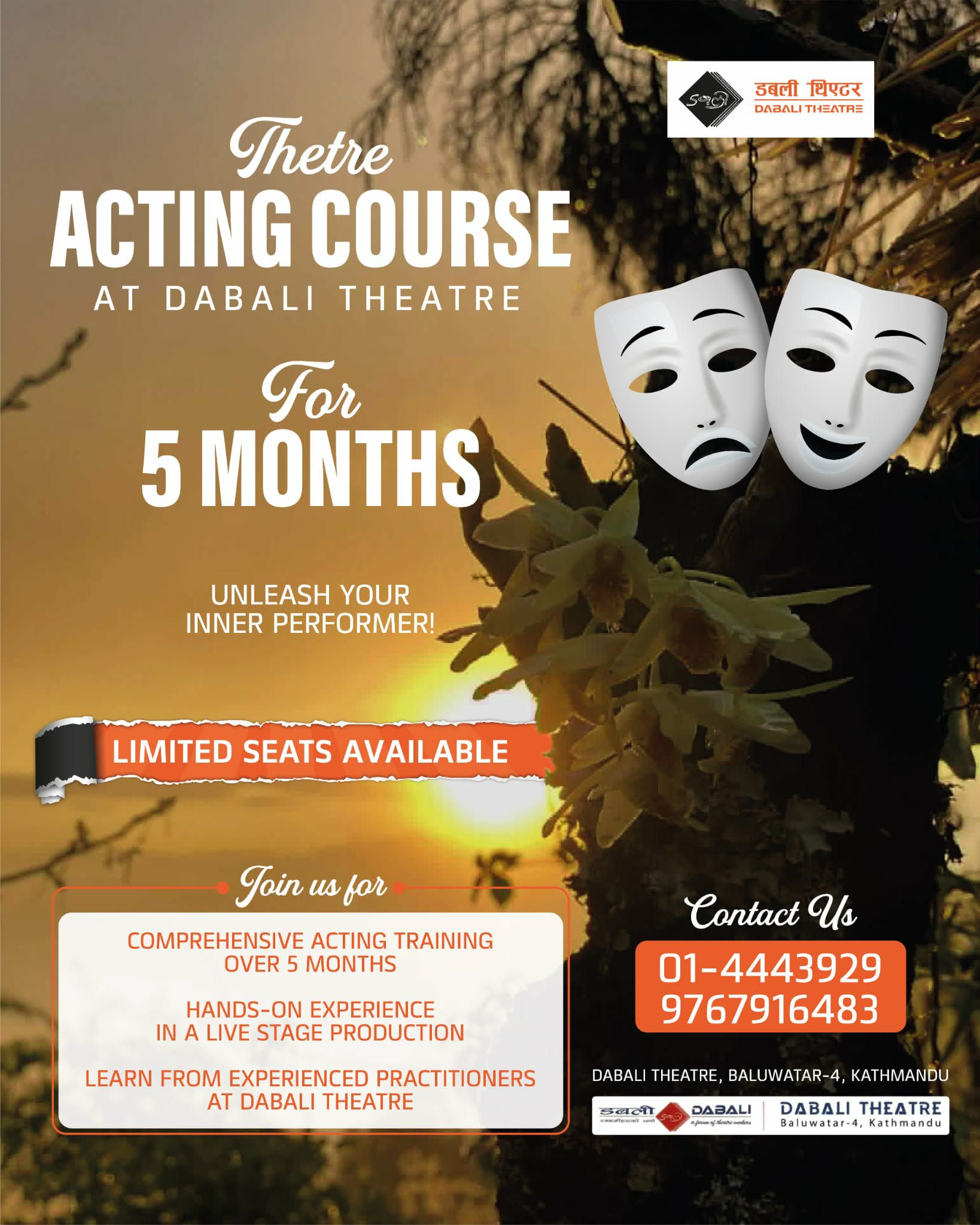 २६– चैत काठमाडौं । दबली थिएटरले पाँच महिने नाट्य अभिनय तालिम सञ्चालन गर्ने घोषणा गरेको छ। नाट्यकला क्षेत्रमा रुचि राख्ने तथा अभिनयमा दक्षता हासिल गर्न चाहने व्यक्तिहरूलाई लक्षित गर्दै उक्त तालिम सञ्चालन गर्न लागिएको हो। तालिममा सहभागीहरूले अभिनयका आधारभूतदेखि उन्नत विधिसम्मको ज्ञान तथा सीप हासिल
