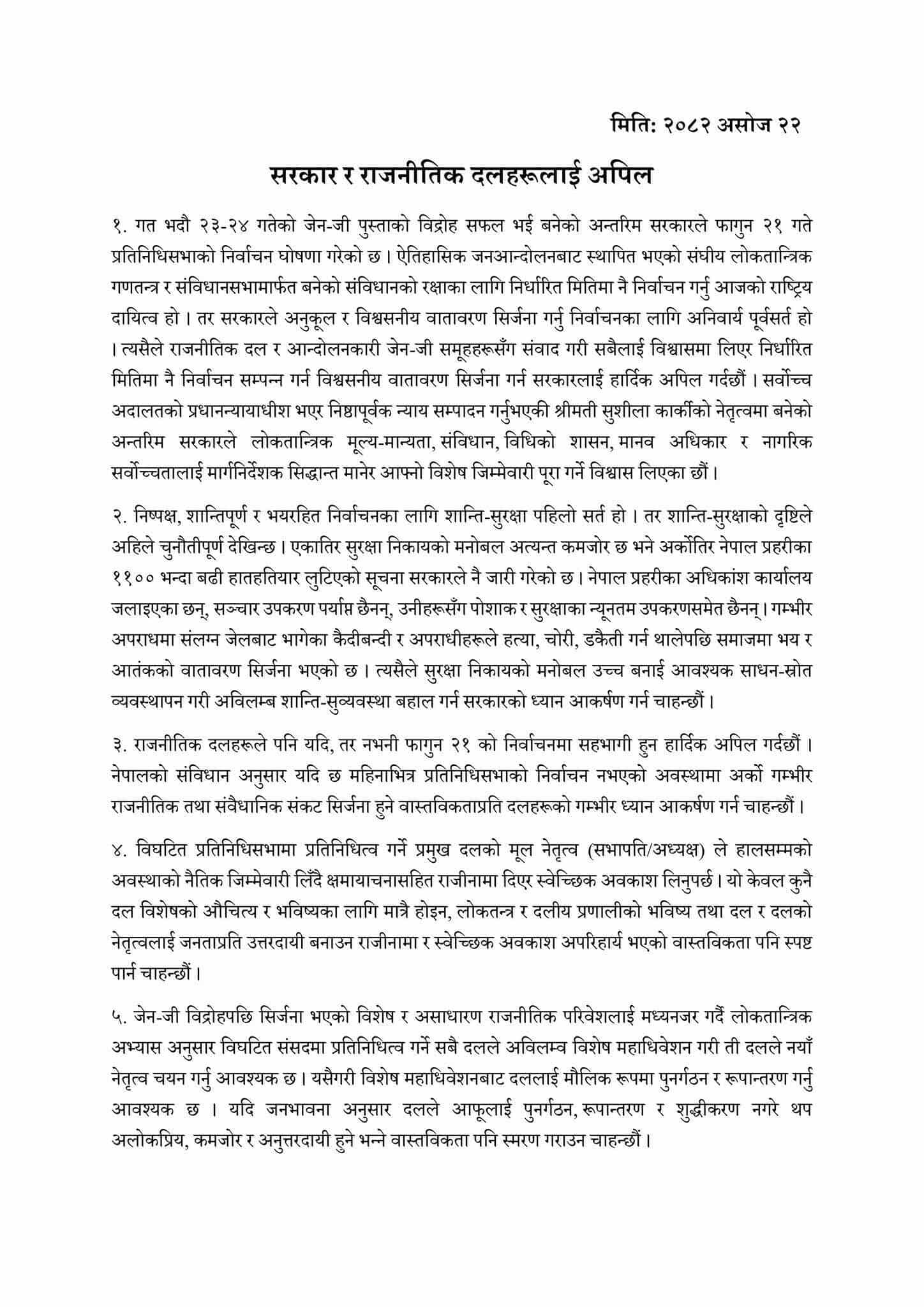 काठमाडौँ । नागरिक अगुवाहरूले आगामी फागुन २१ को निर्वाचन सम्पन्न गर्ने विश्वसनीय वातावरण बनाउन सरकारसहित सम्बद्ध निकायलाई आग्रह गरेका छन् । कृष्ण खनाल, केदारभक्त माथेमा, केशव दाहाल,खगेन्द्र सङ्ग्रौला,गेजा शर्मा वाग्ले,चरण प्रसाईँ, चन्द्रकिशोर, झलक सुवेदी लगायत ३० जना नागरिक अगुवाले बुधबार संयुक्त अपिल जारी गर्दै यस्तो